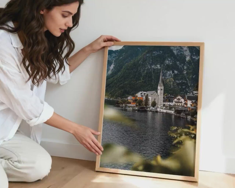 This fine art print of Hallstatt is a cinematic Austrian Alps lake village scene designed to bring Austria’s quiet mountain magic into your space. 🇦🇹 I captured this photograph in Hallstatt, Austria on an August day, softly framed through tree leaves as if the village was hiding in plain sight—calm water, a stone church spire, waterfront homes, and dramatic mountains behind it.