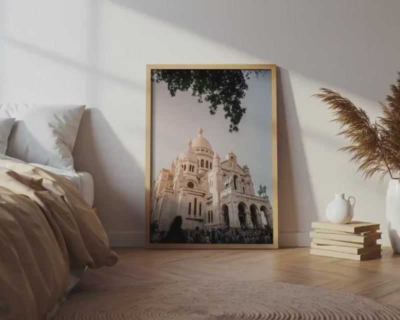 This fine art print of Paris’s Sacré-Cœur Basilica is a warm Montmartre architecture scene designed to bring France’s timeless calm into your space. 🇫🇷 I captured this photograph in Montmartre, Paris, France looking up at Sacré-Cœur as the last light softened the white stone into honey, with a quiet canopy of leaves framing the sky.